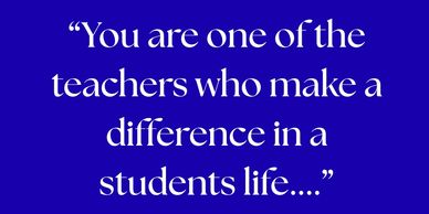 "You're the best teacher I ever had. I always looked forward to your lessons because you made learning interesting...you're so caring and always put others first. Thank you for teaching me so well."